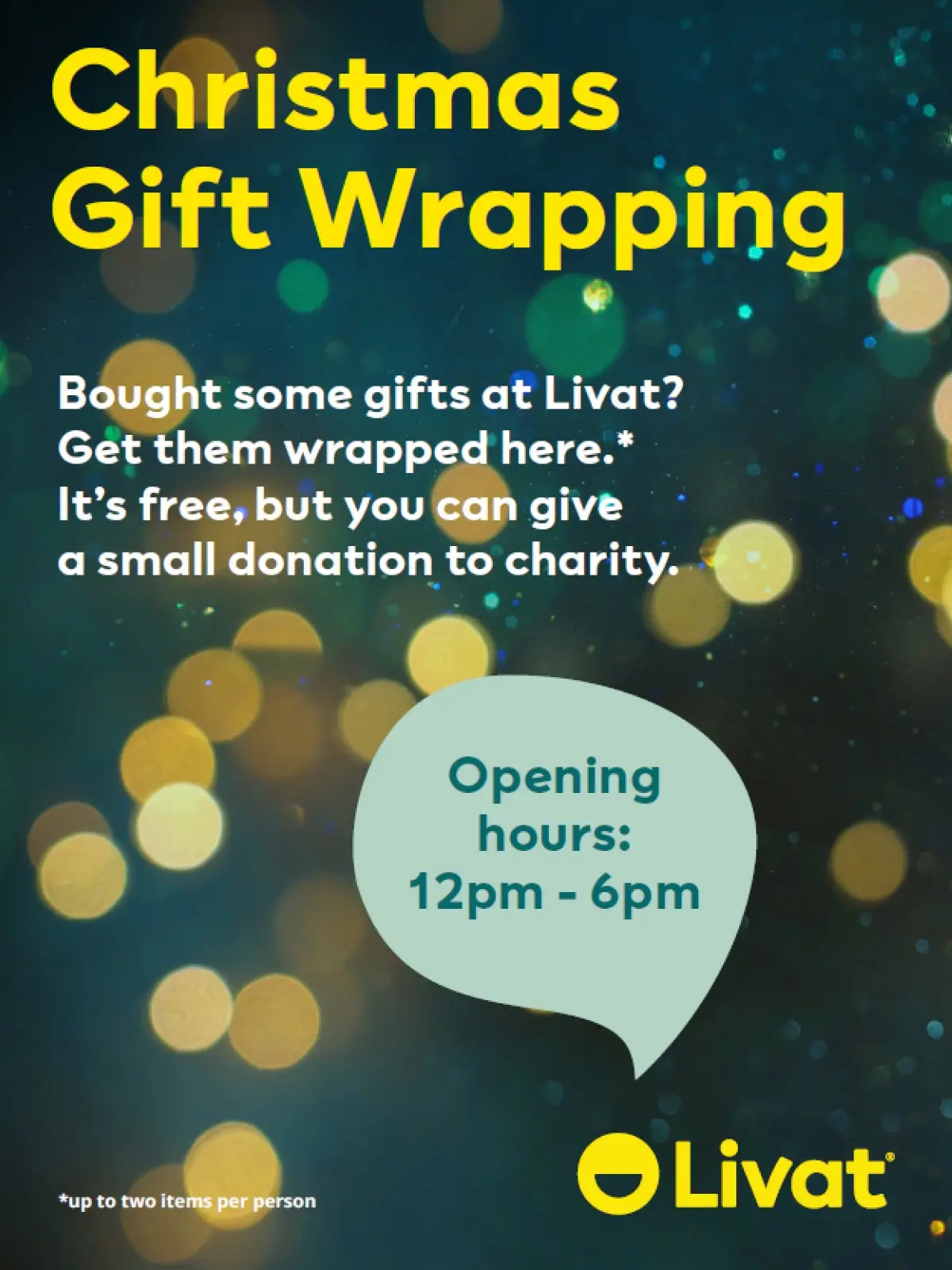 If you’ve purchased your gifts at Livat, simply bring them to our wrapping stand (up to two items per person). It’s free, but you can give a small donation to charity on-site.