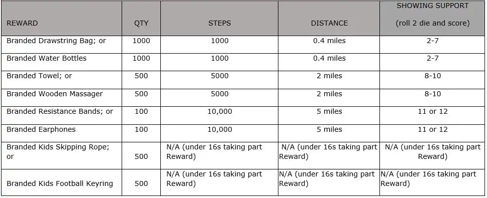 18. The rewards are subject to availability while stocks last. Alternative rewards may be available if the above have run out; a selection of vouchers from Livat retailers with values from £5-£50 based on the steps, distance equivalent or showing support.