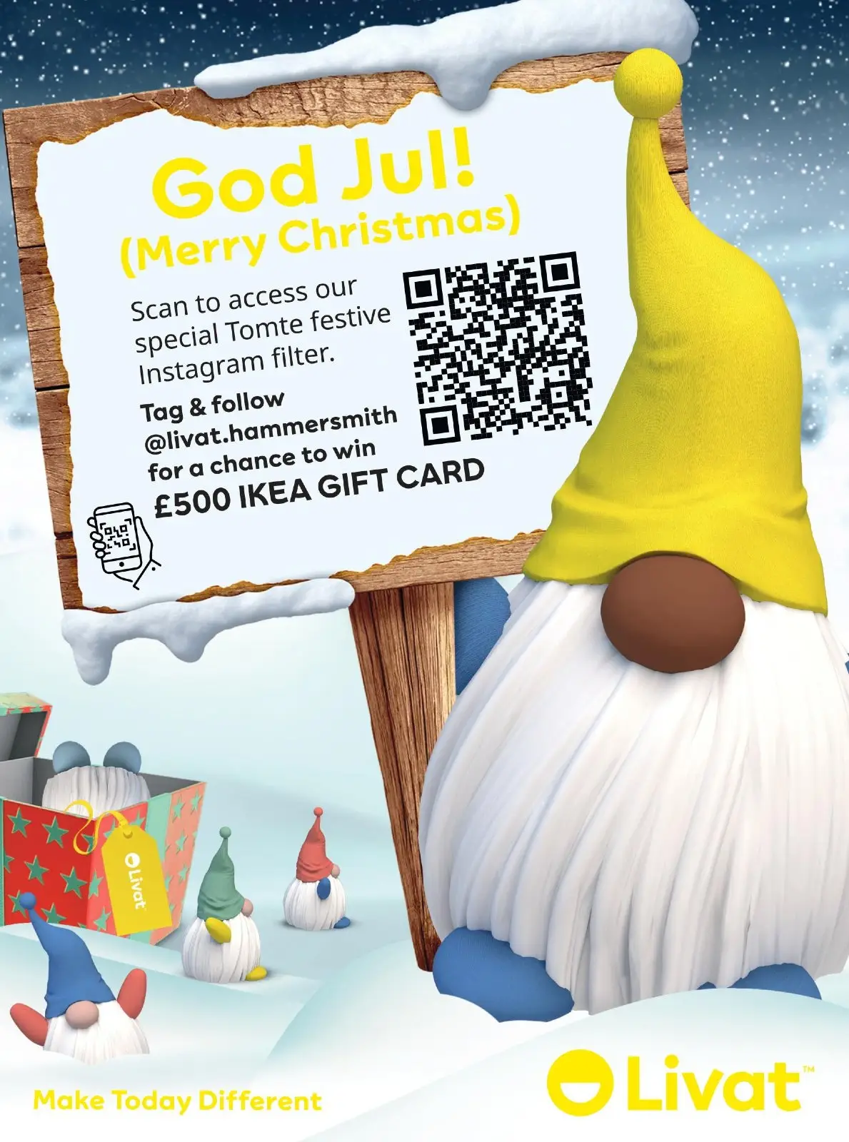 Seek out and scan the QR codes our mischievous Tomtes are holding, to create some merry and magical content with our Tomte Instagram filter.